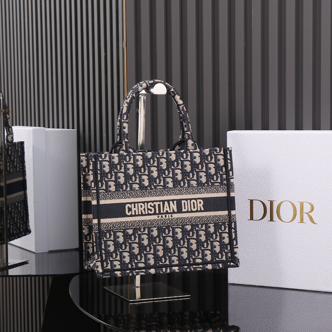 Small D*0r Book Tote Ecru and Blue D*0r Oblique Embroidery 10.5 x 8.5 x 5.5 inches