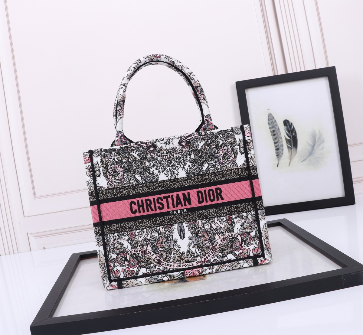Small D*0r BOOK TOTE WHITE AND PASTEL PINK BUTTERFLY AROUND THE WORLD EMBROIDERY 10.5 x 8.5 x 5.5 inches